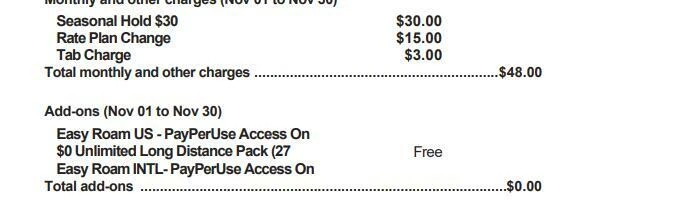 based on your image the charges seem correct. As you had a rep place you on a seasonal hold as opposed to doing it in self-serve there is a $15 service charge for them to change the plan to a seasonal hold plan. The service fees can be found below.