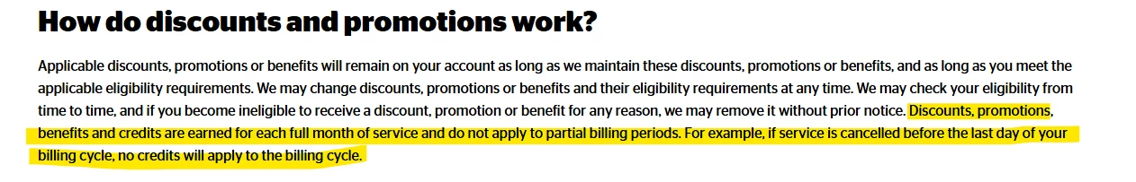 If the service is cancelled before the end of the billing cycle, then the bill credits that were applied for that billing cycle will be charged on the final bill.