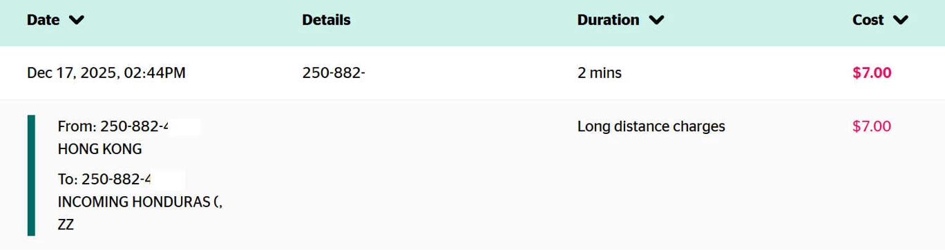 I am travelling in HONDURAS. The report shows a call, originating in HONG KONG and incoming to Honduras, with MY TELEPHONE NUMBER as both the FROM and TO number. I did not answer any calls on the day in question as I was travelling, and there are no other calls listed, in Koodo or on my phone, for that date. There is a VOICE MESSAGE icon shown on the phone which appeared around the date in question, which I have not retrieved.