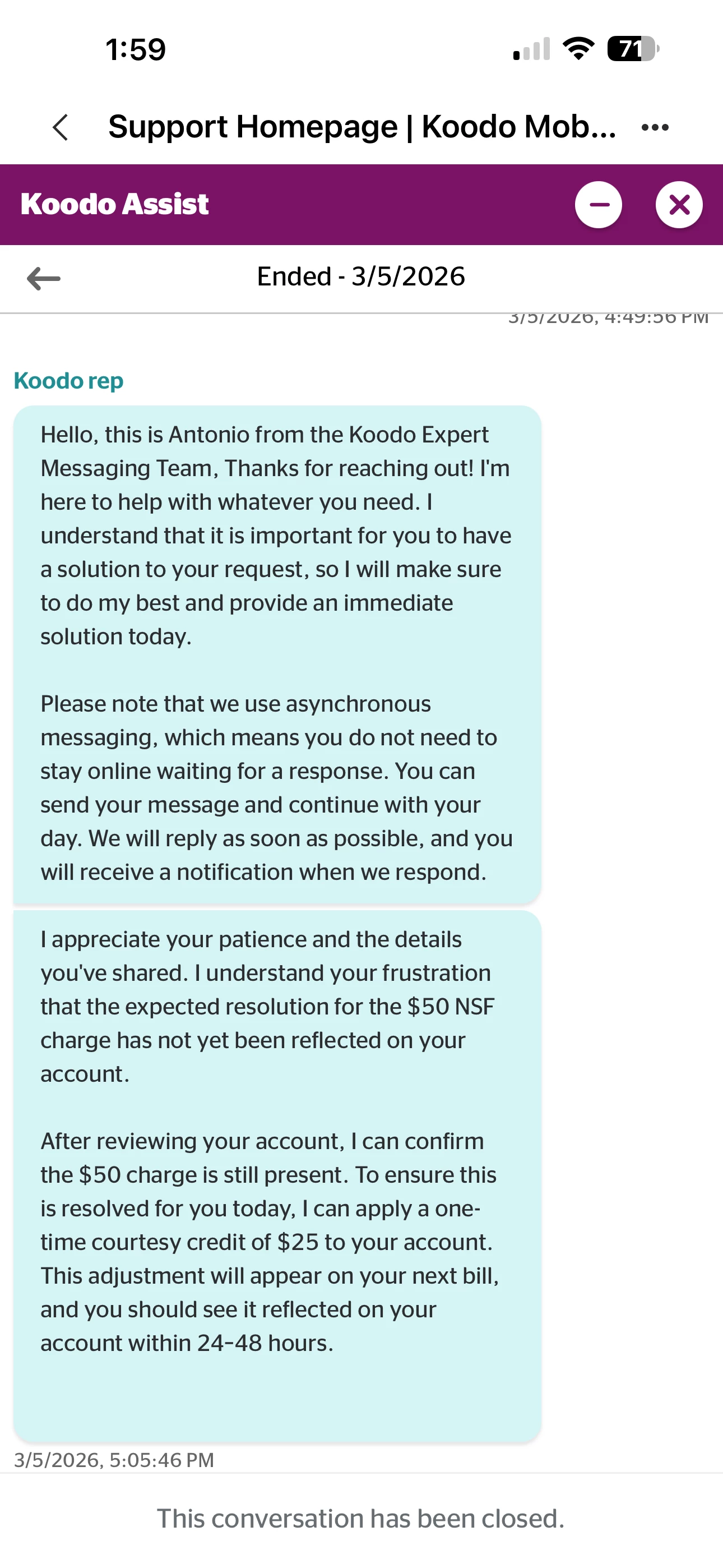 Hi there! I connected your Koodo Rep yesterday and one nice guy whose name is Antonio said he could offer me a one-time courtesy credit of $25 to my account . I told him that I want to have a discussion with your callback service because one guy whom I talked to on the phone said he had already erased the extra charge… but later on I still found it’s there and never gone. And now I decide to accept his offer. Hopefully it’s still available! Because I’m fairly new to Canada and I didn’t pay attention to my balance of the debit card which I set up for the automatic payment failed. Unfortunately the bank withdrew certain amount from my account and the bill was failed to pay fully.I didn’t know that I was charged for NSF fee for $50 until I received the message from your company. I hope that you could try to help me to avoid the charge and help me to get the amount refunded or please just keep the promise to give me the one-time courtesy credit of $25 to my account. Thank you for your support!