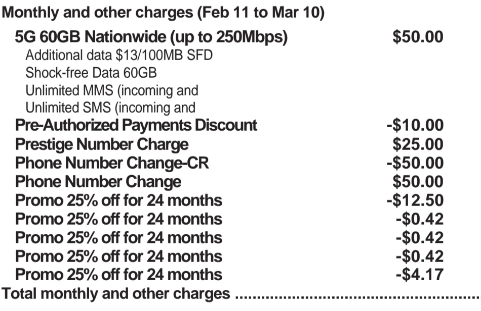 New customer and the 2 lines ported in got billed $25 prestige number billing so both lines are $25 a month more than the contract rate