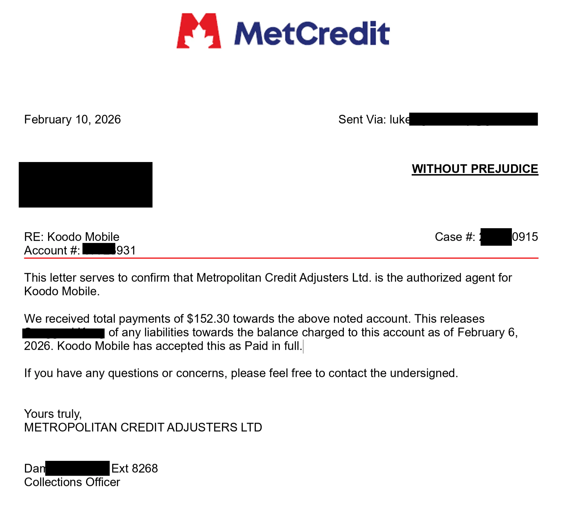 Recently, I found out that Koodo sent a $28 charge to the collections and the delinquent account has been accruing interest of 41% since then. I would like to know more details on the $28 fee and dispute the charge with Koodos since MetCredit cannot do anything other than providing settlement offer or payment option in full. Disputes have to go through Koodos according to the MetCredit agent.