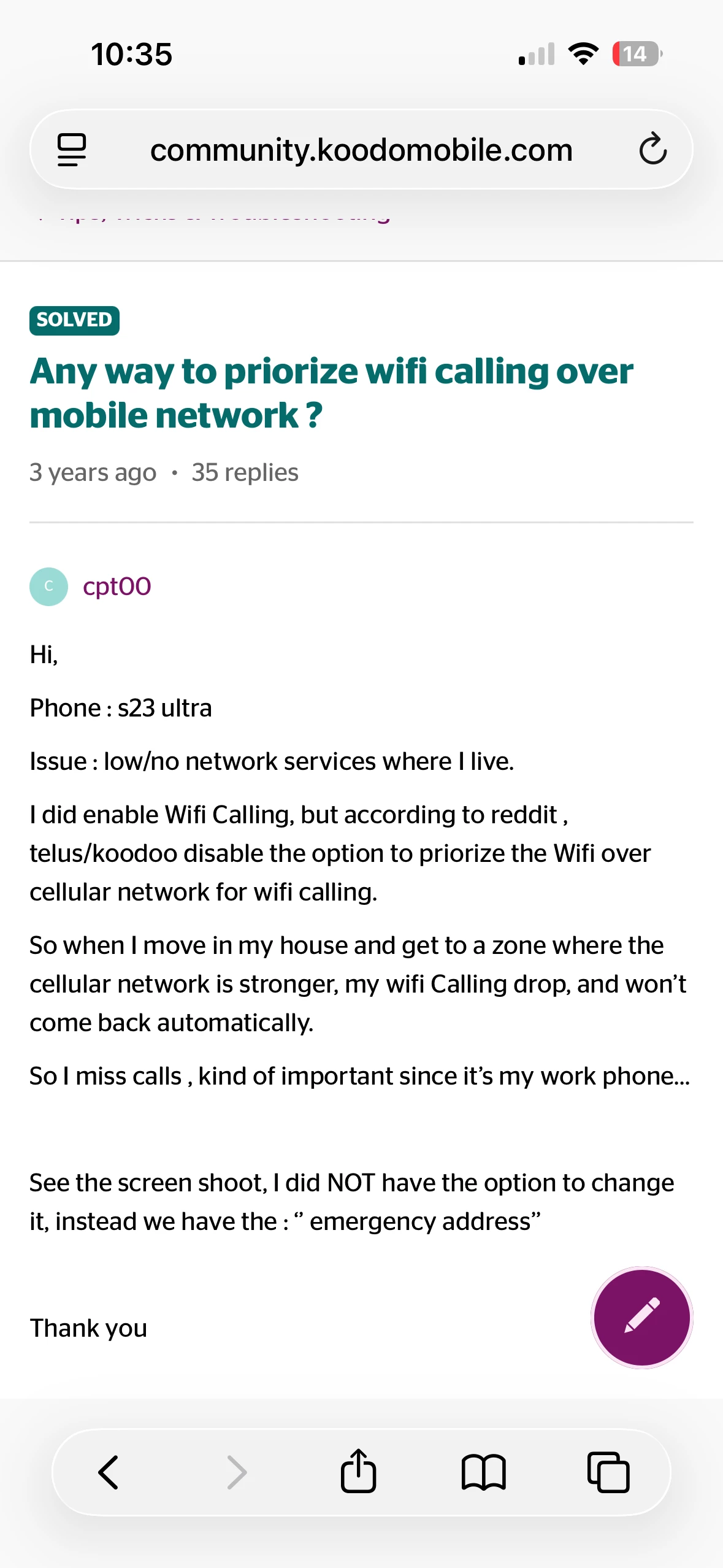 When in areas that Koodo has 1 or 2 bars, wifi calling is not being allowed to fully take over and stay in priority and the call audio drops off and gets jumbled and distorted. It sounds exactly the same as the areas on some roads that have only cell network and weak 1 bar conditions.
