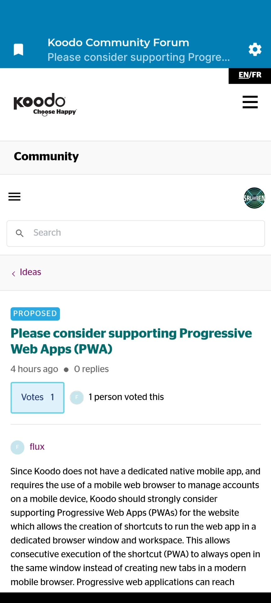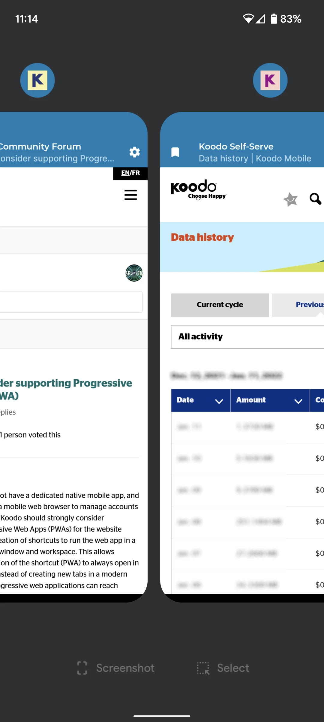 Since Koodo does not have a dedicated native mobile app, and requires the use of a mobile web browser to manage accounts on a mobile device, Koodo should strongly consider supporting Progressive Web Apps (PWAs) for the website which allows the creation of shortcuts to run the web app in a dedicated browser window and workspace. This allows consecutive execution of the shortcut (PWA) to always open in the same window instead of creating new tabs in a modern mobile browser. Progressive web applications can reach anyone, anywhere, on any device with a single codebase. PWAs are very powerful, versatile, and functional, and, in many cases, can completely eliminate any future need for resources to be wasted on parallel development of a dedicated native app. PWAs are the future of apps. Thank you.