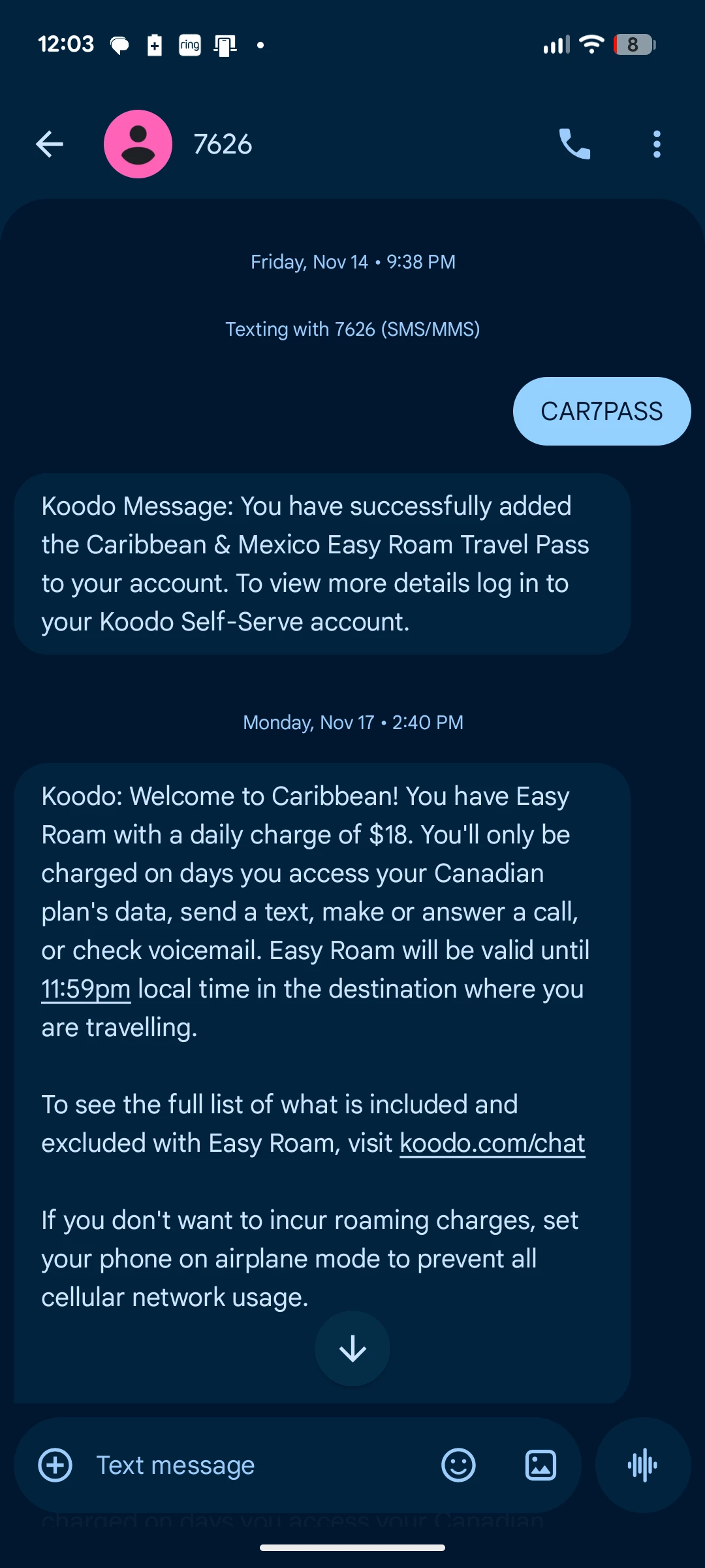 I recently traveled to Barbados and texted “CAR7PASS” to 7626 and received a message back stating that i’d successfully added Caribbean and Mexico easy roam travel pass. I checked my bill when I got home and I was still charged the $18 a day for easy roam without the travel pass. Did I do something wrong?