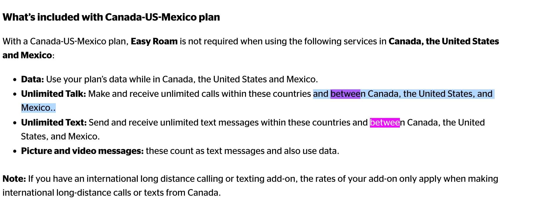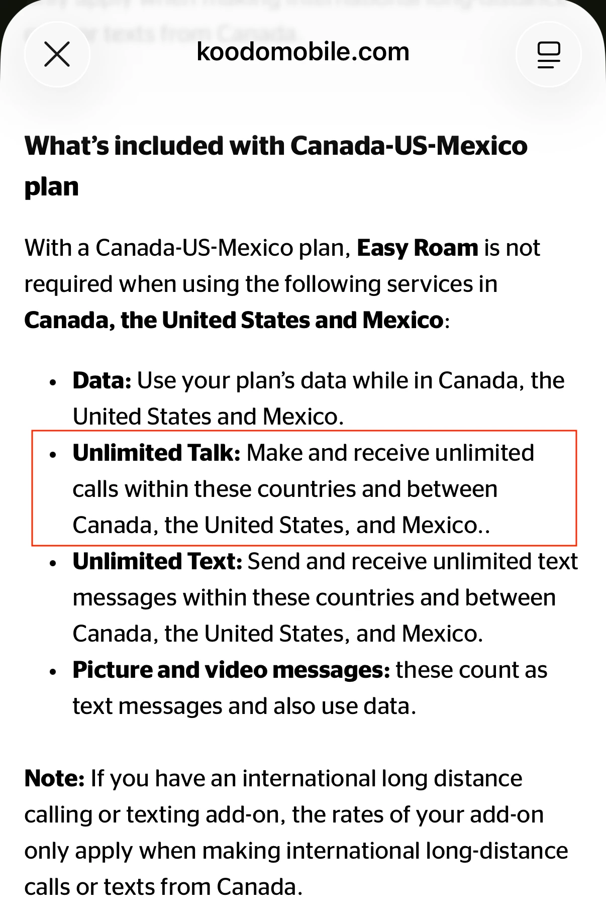 CONCERN: I turned up documents on the Koodo site that suggest you can call/text/data both within and BETWEEN the three countries, which would counter the need for the Unlimited Long Distance Pack and contradict the agent’s advice.