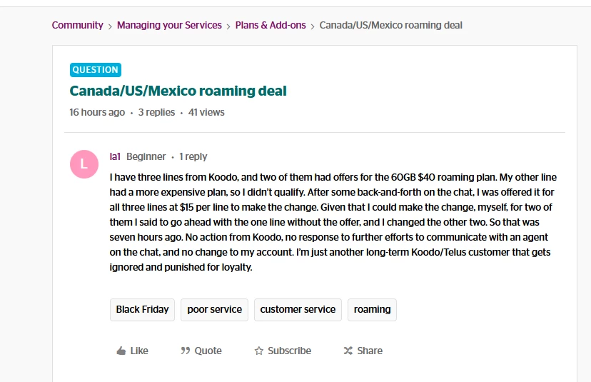We have been with Koodo for over 15 years, always pay on time, in full, never any issue with our account. We have at various times had up to five phones with Koodo. Now that our kids are adults, they have their own separate accounts, and we have two phones on our account currently. In the past, as our needs changed, we would speak to an agent on the phone after reviewing what plans were available and the customer loyalty department was always able to sign us up for any plan we wanted that was posted on their website, regardless of whether it was an offer in our account or not. We currently have a plan for $64 with 100GB of data, Canada-US roaming, unlimited Canada wide messaging and a free perk of unlimited long distance. There is a plan posted for new customers, $40 for 60GB Canada-US-Mexico roaming and unlimited international SMS and one free perk. We don’t need 100GB, 60GB is more than plenty, so I tried to switch. The difference now from years previous? No thank you for being a long time customer, no acknowledgement of our loyalty to Koodo, just a ‘no’ that’s only for new customers, the best offer for a plan with less GB and a lower price is $60 for 80GB, no US-Canada-Mexico roaming and I have to sign up for auto pay to get the plan for $50. So really, less service and $4 less in price. So old customers are paying higher prices to subsidize offering new customers lower prices. Can I ask what is the point of disregarding loyal customers to favour new ones? Is Koodo trying to drive people to their parent company Telus?