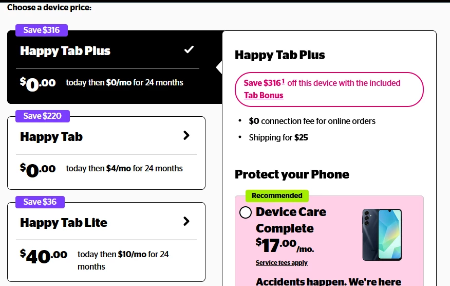 Every tab option comes with a bundle of specific plans you can choose from. For Happy Tab Plus, the monthly rate plan cost is higher.