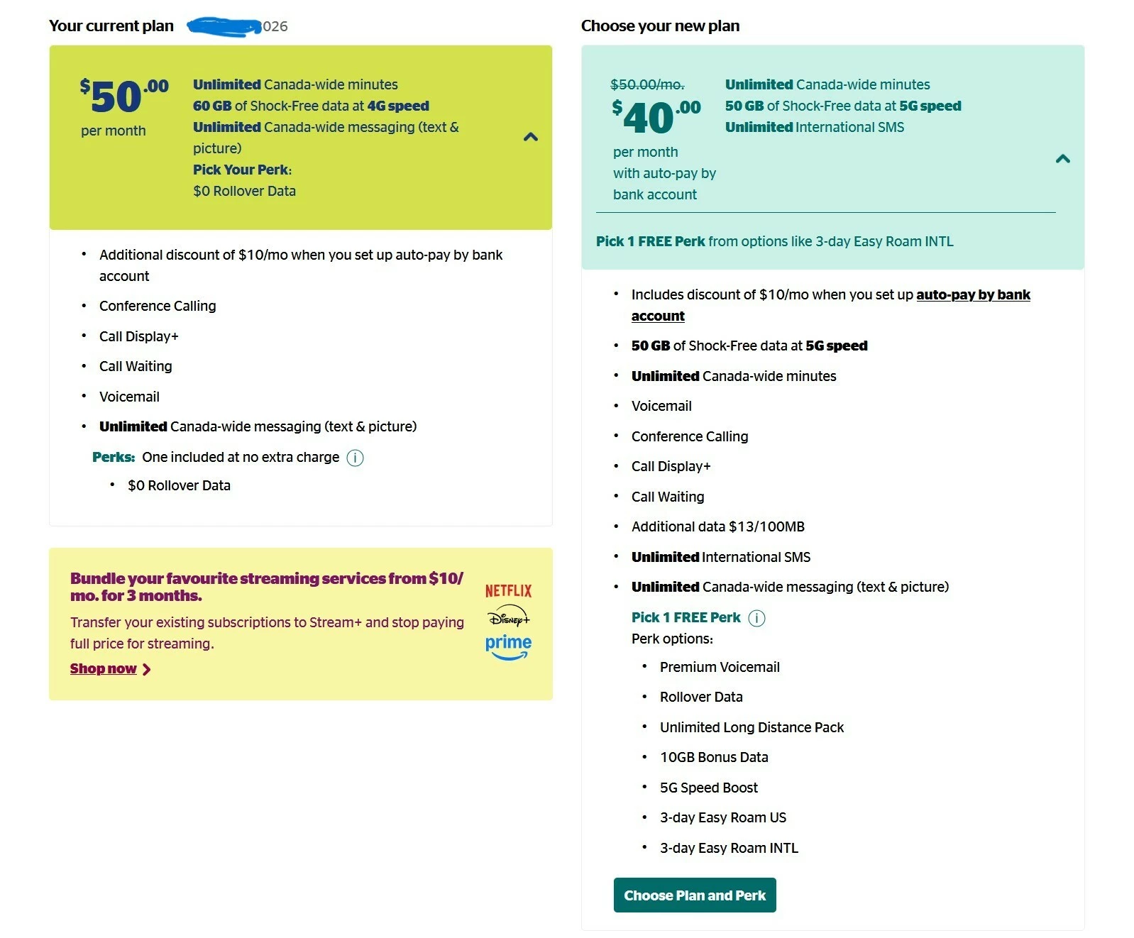 Three numbers on my account, one has a $50 a month 4G plan with $10 discount and there’s an offer for the same with 5G data and better perk options.