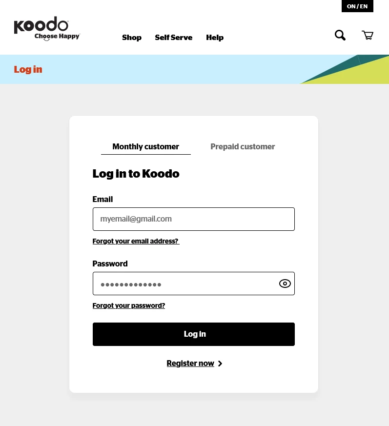 The last email from Koodo was titled “Hooray! You're now registered for Koodo Self Serve” with the message “Thanks for registering for Koodo Self Serve! Give yourself a pat on the back. Now you can easily manage your subscription anytime! Log in now All the best,
